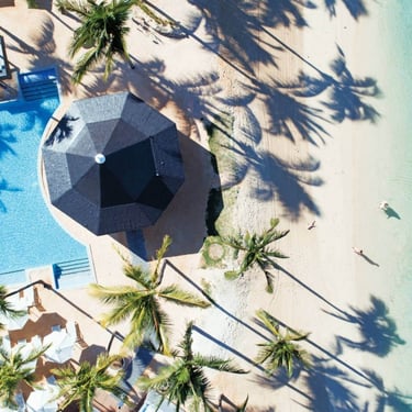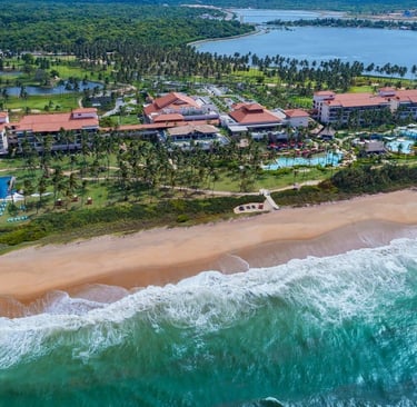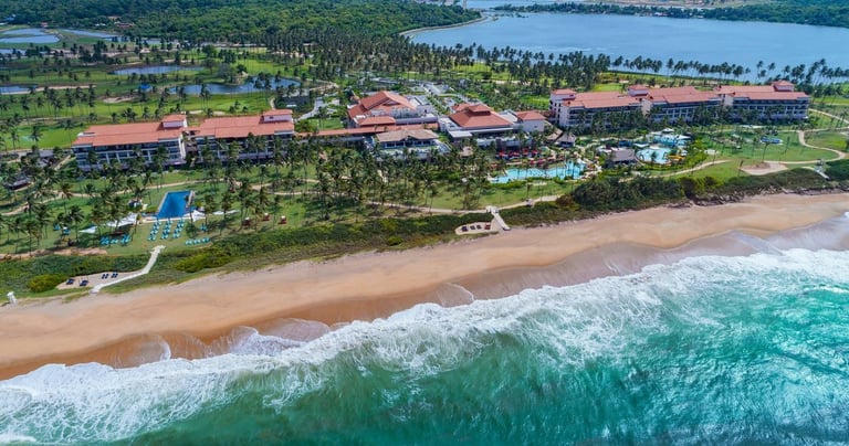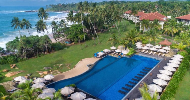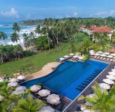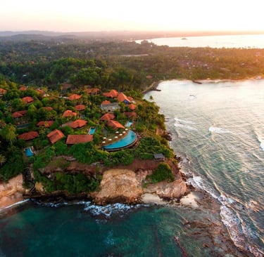 A modern tropical resort on a cliff overlooking the Indian Ocean, surrounded by a coconut plantation and a tranquil atmosphere.